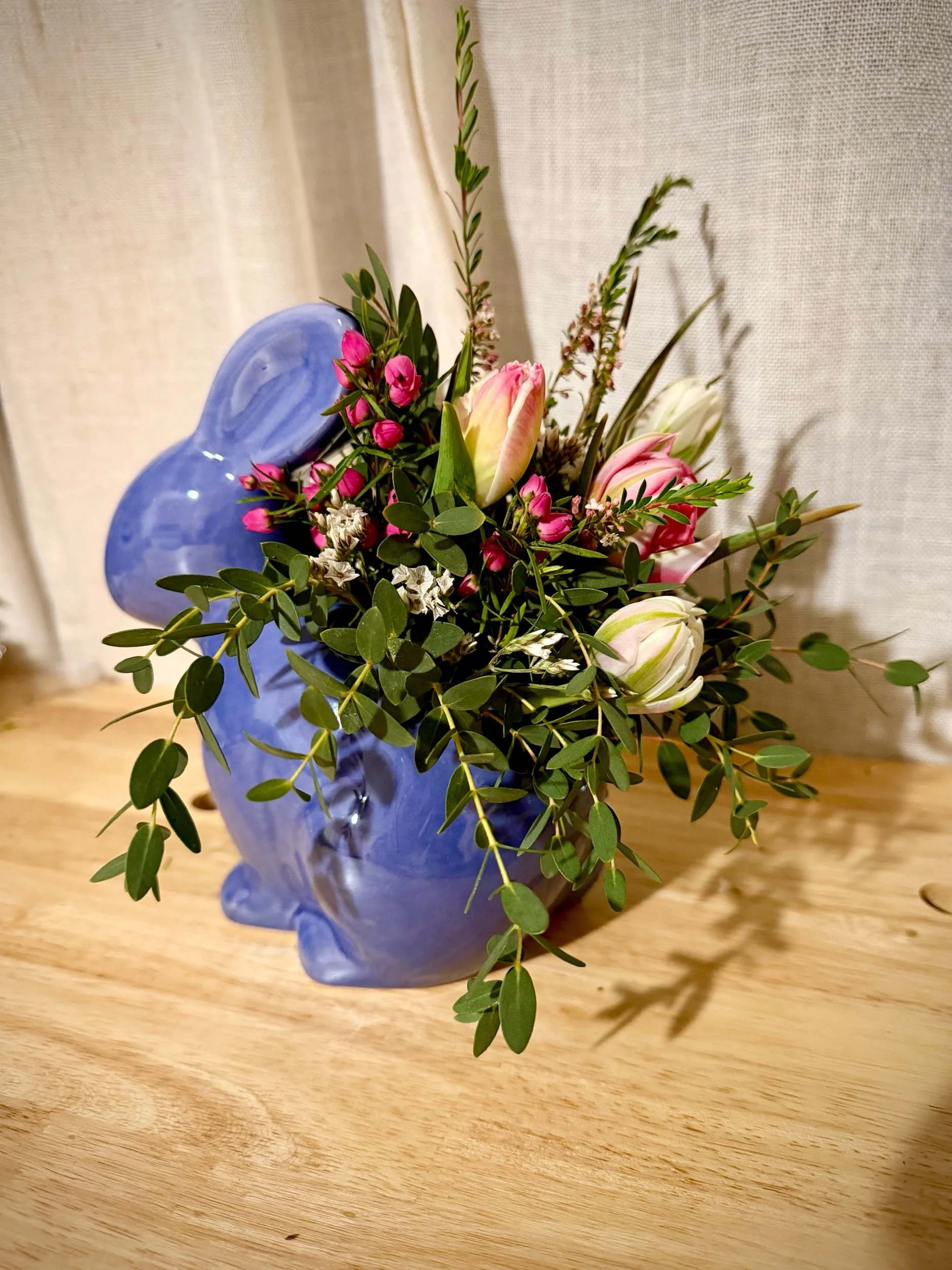 Each bunny is filled with a fresh mix of seasonal blooms, thoughtfully designed using Vermont-grown flowers whenever available and premium sourced stems to complement the design.